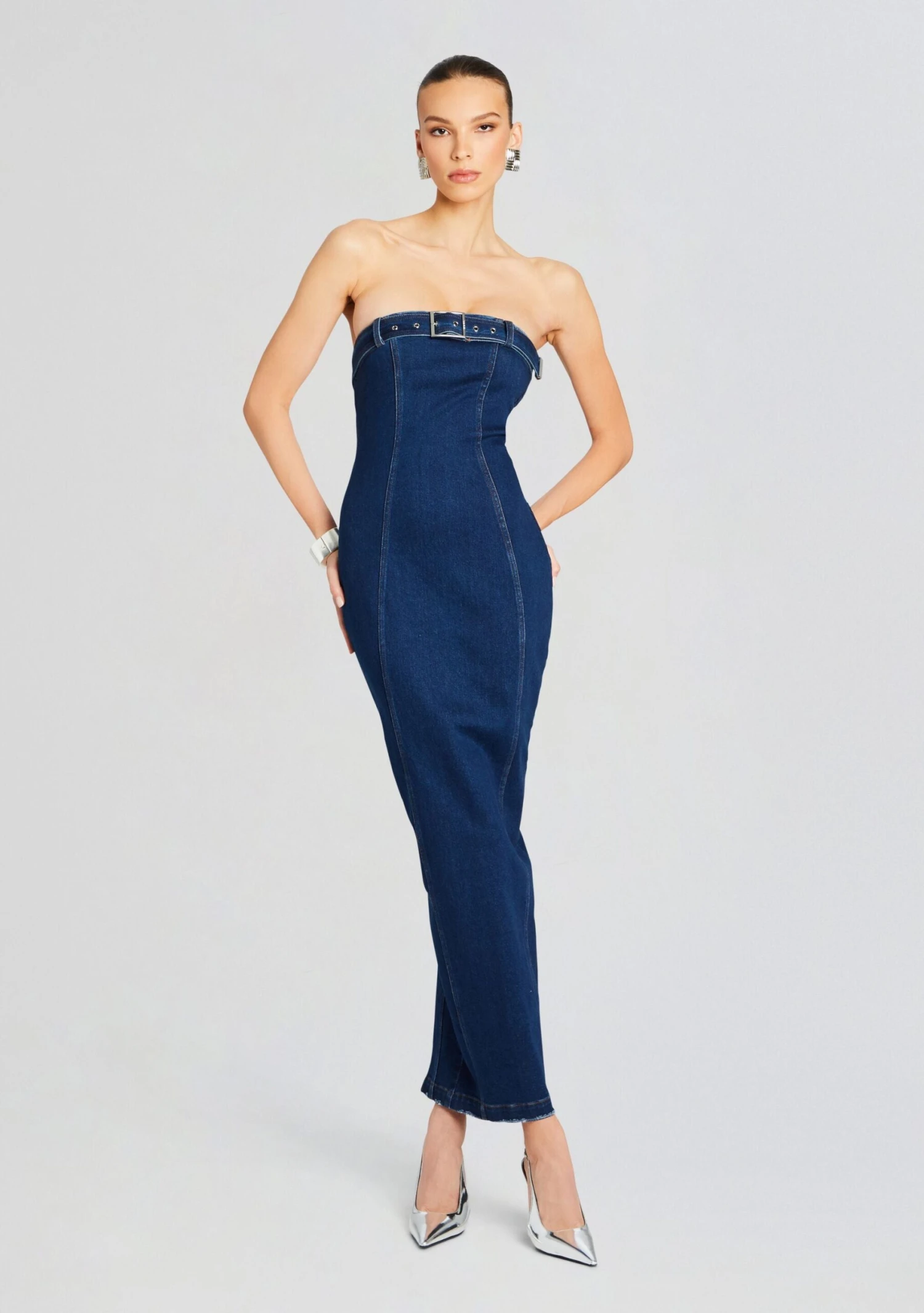 Make a bold fashion statement with SER.O.YA’s Aaliyah Dress. This strapless denim maxi dress features stunning belt buckle detailing across the neckline and a flattering bodycon fit. Crafted from premium denim, this dress effortlessly combines style and comfort for a show-stopping look. Show here in Deep Sea.