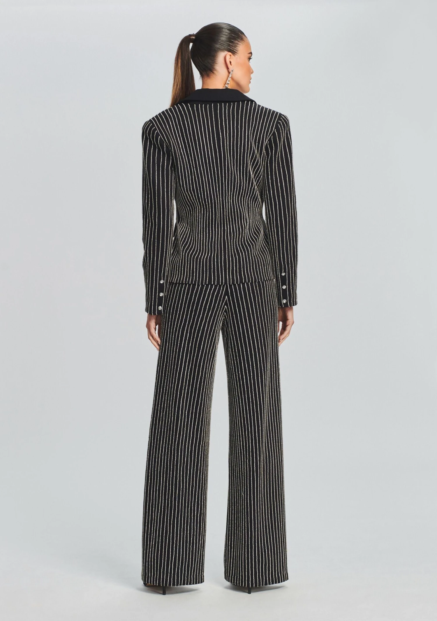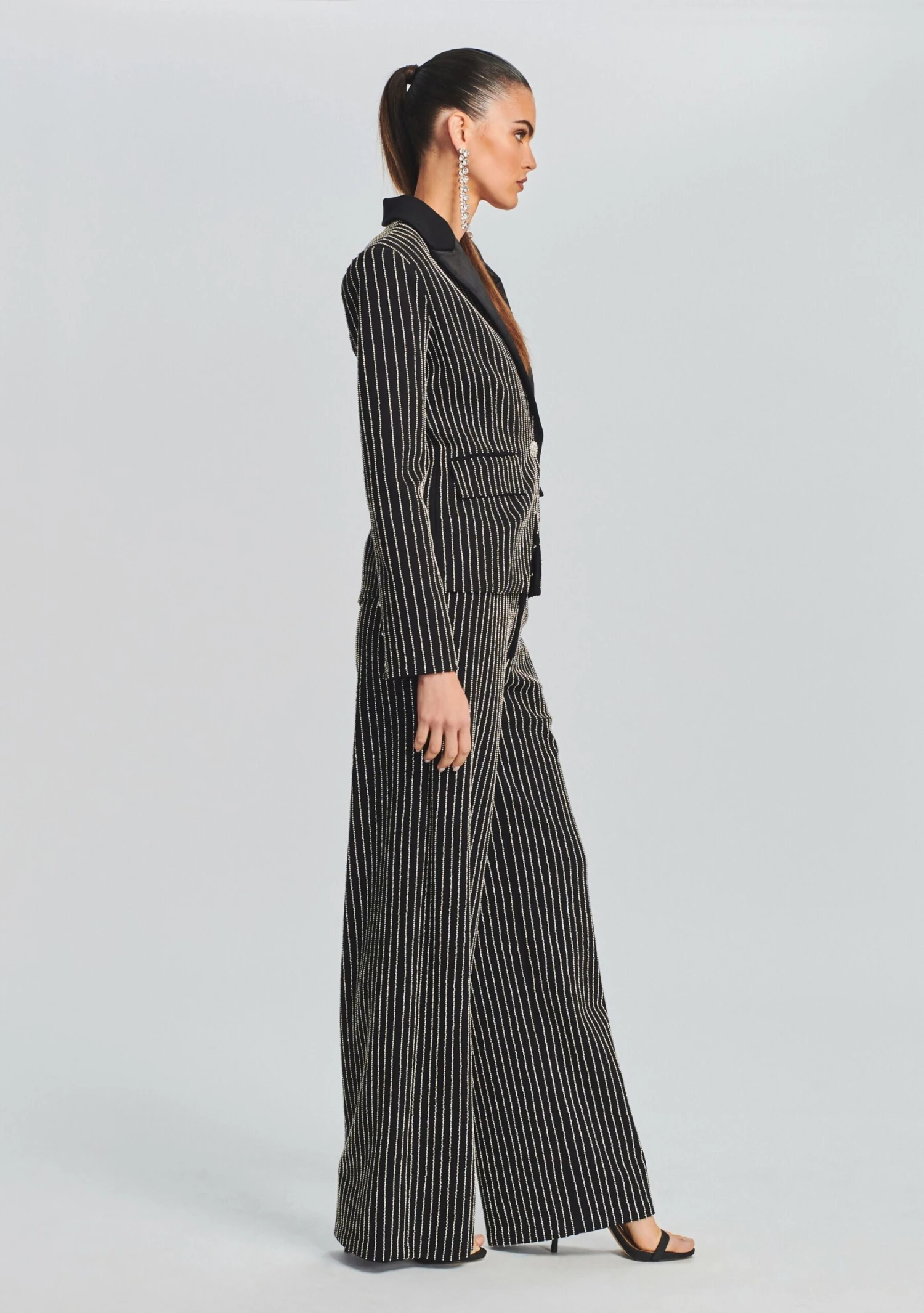 Shimmer and shine in our Bowery Blazer. This dazzling blazer features rhinestone paneling throughout, contrasted by a satin collar and with front pockets and jewel button closure. Wear it on your next night out with our matching Lenox Pant and Ellisha Top. Shown here in Black.