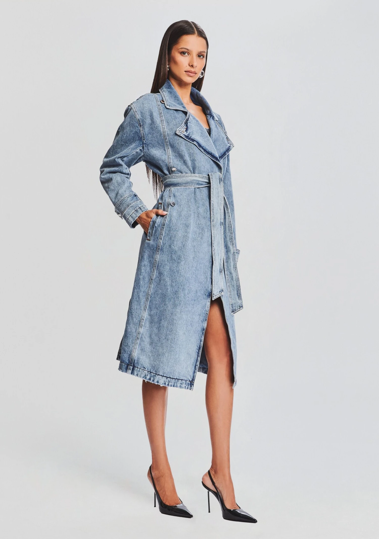 Introducing our chic Dakota Jacket—a versatile wardrobe essential that seamlessly transitions from day to night, ensuring you stay cute and stylish around the clock. The classic denim fabric offers a timeless appeal, while the trench coat design adds a touch of sophistication to elevate your look. Make every day a stylish affair, turning heads and capturing hearts with this iconic coat. Shown here in Alani.