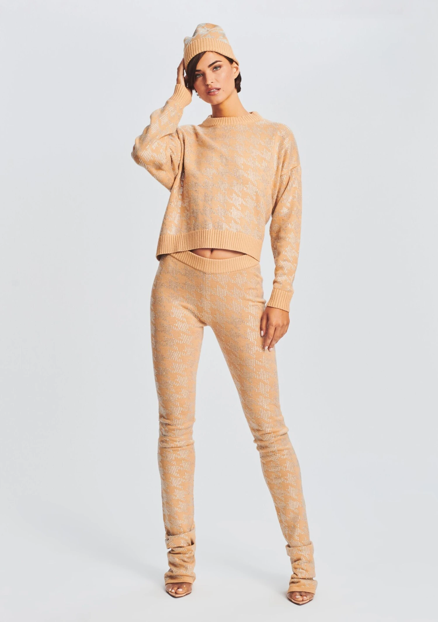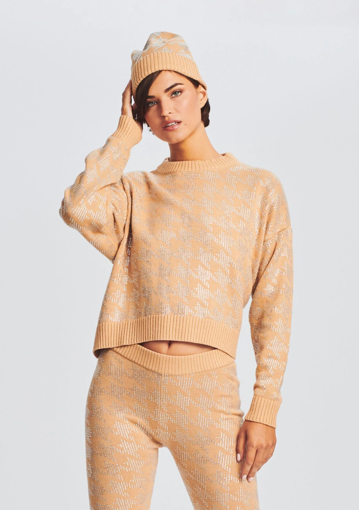 Our Delilah Beanie is one of the season’s most-needed knits. Featuring a rhinestone houndstooth pattern throughout, this oversized beanie pairs perfectly with our Mal Sweater and Desiree Pants. Shown here in Caramel/Silver Houndstooth.
