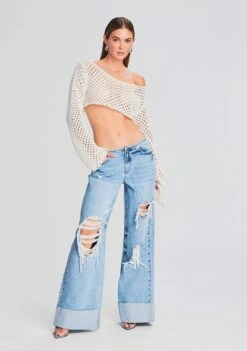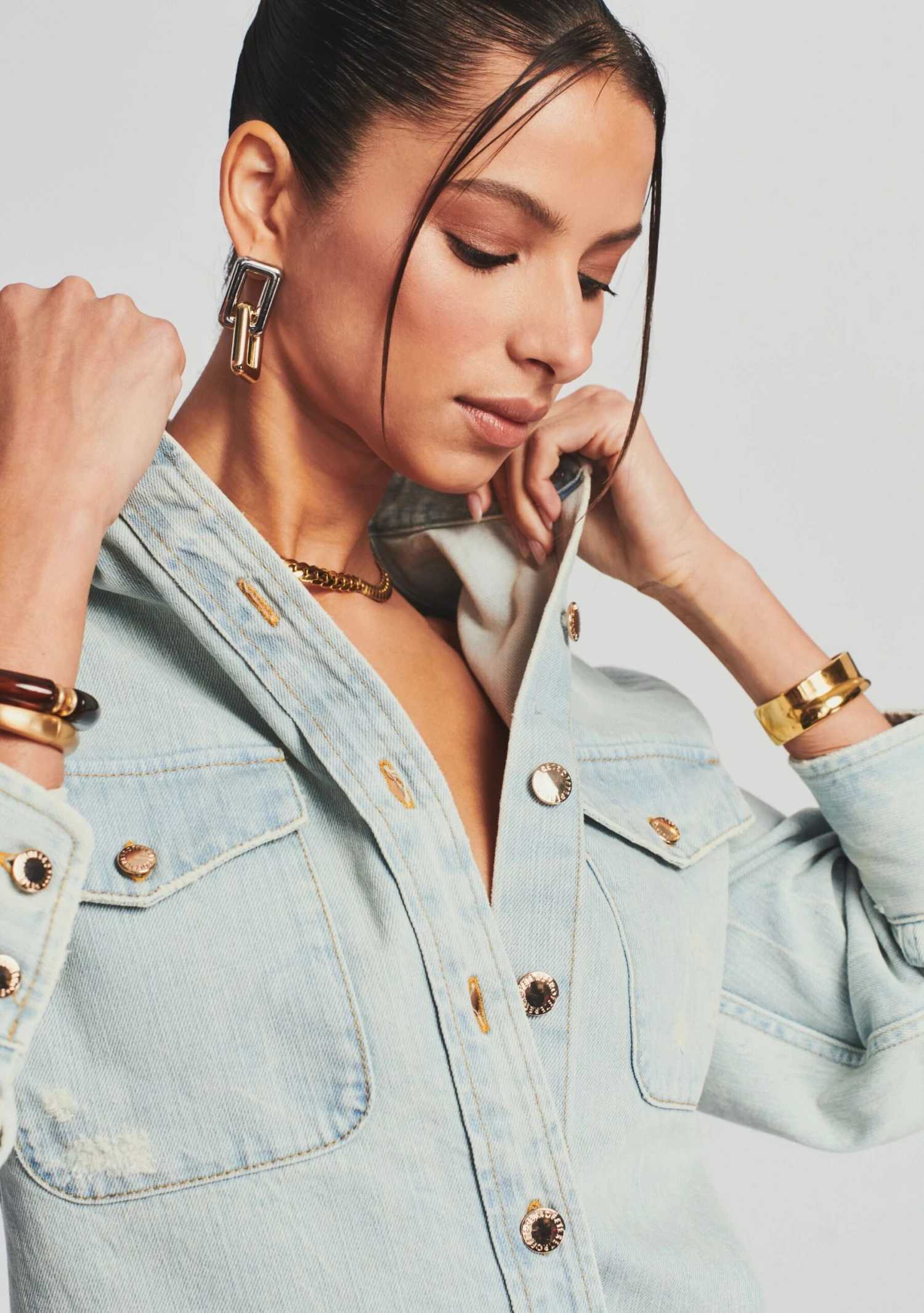 Who says you can’t look polished even on low-key days? An edgy take on a denim classic, our Doreen Shirt simplifies everyday dressing. The distressed button-down top can be worn closed or open and layered with a graphic tee. Shown here in Blue Dawn.