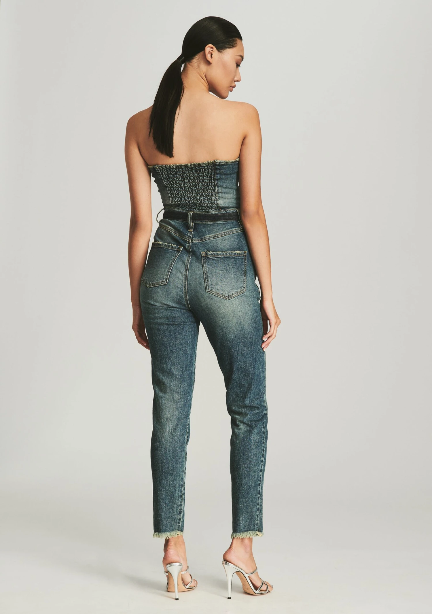 The Dree Jumpsuit is nod to early ’00s nostalgia. A belt cinches the waist for a figure-flattering fit, while a strapless neckline and a raw hem complete the look. Finshed with a side zipper. Shown here in Ariel.
