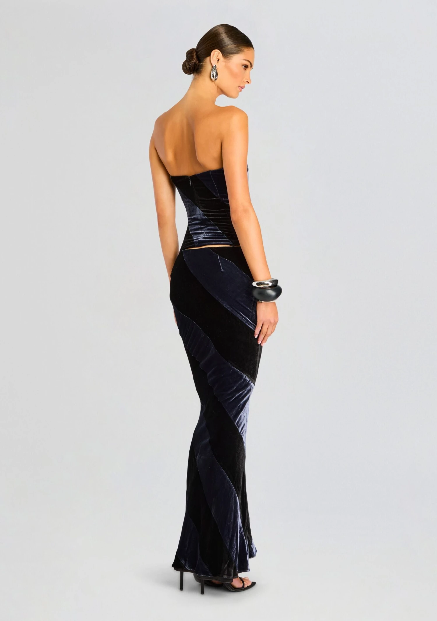 Indulge in luxury with our Dulce Velvet Top, shown here in Black/Navy. This sumptuous velvet top features a strapless design that enhances your silhouette, creating a look that’s both sultry and sophisticated. Perfect for pairing back to the matching skirt or trousers, it’s a statement piece for your evening wardrobe. Shown here in Black/Navy.