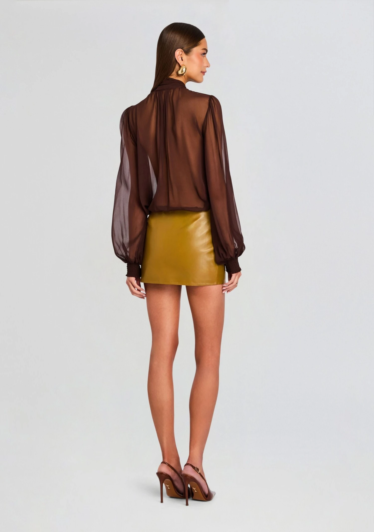 Indulge in luxurious elegance with our Hasli Silk Chiffon Top. The sheer blouse exudes sophistication while the delicate pussy bow adds a touch of refinement. Perfect for daytime, this silk top effortlessly elevates any outfit. Embrace the opulent charm of this exquisite piece. Shown here in Tobacco.