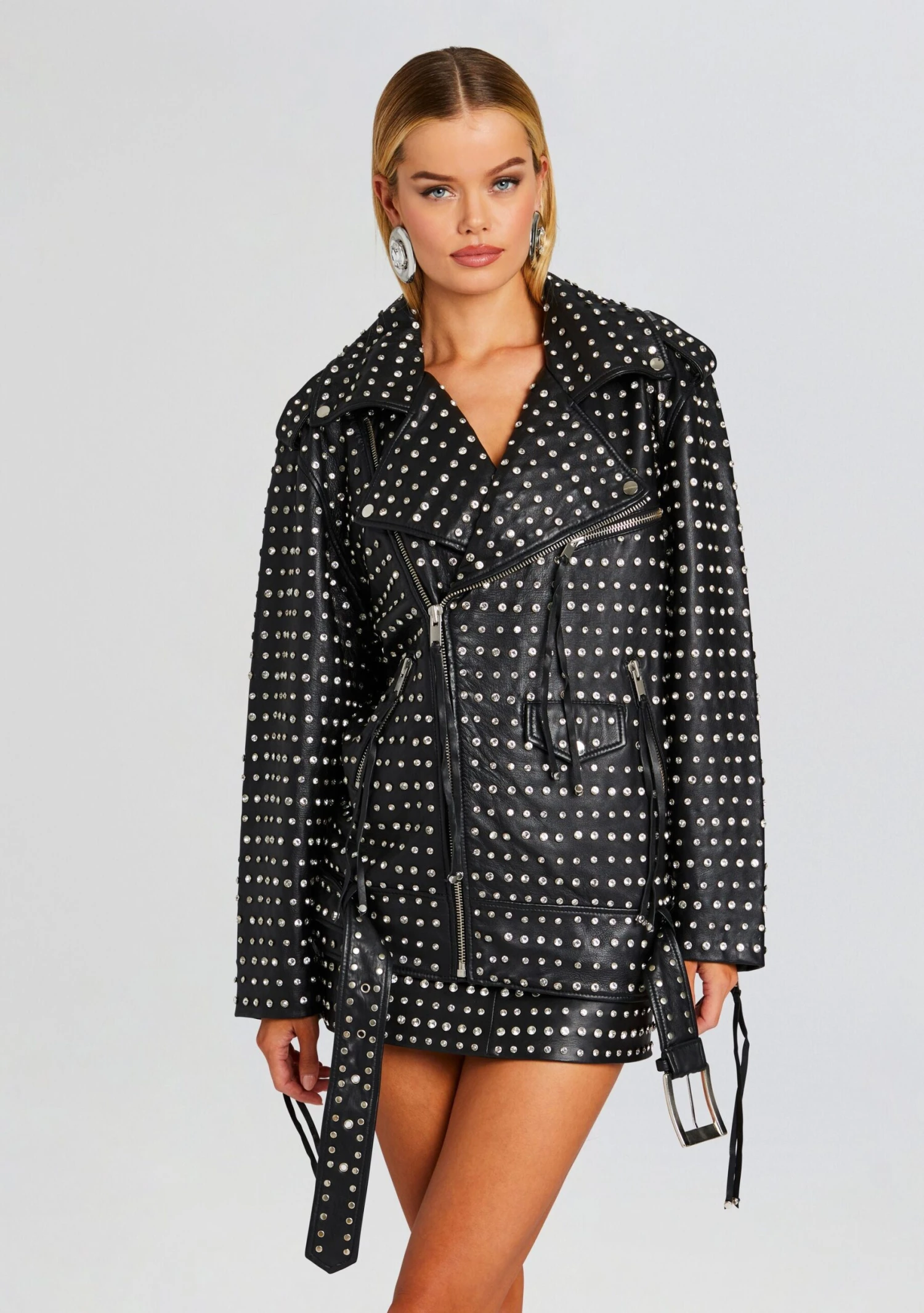 Living up to its name, our Icon Jacket is crafted with exaggerated moto-details: oversized notched lapels, a buckle belt and all the zip pockets you could need. This statement piece gives leather a sparkly upgrade with all-over crystal rhinestones. Shown here in Black/Crystal.