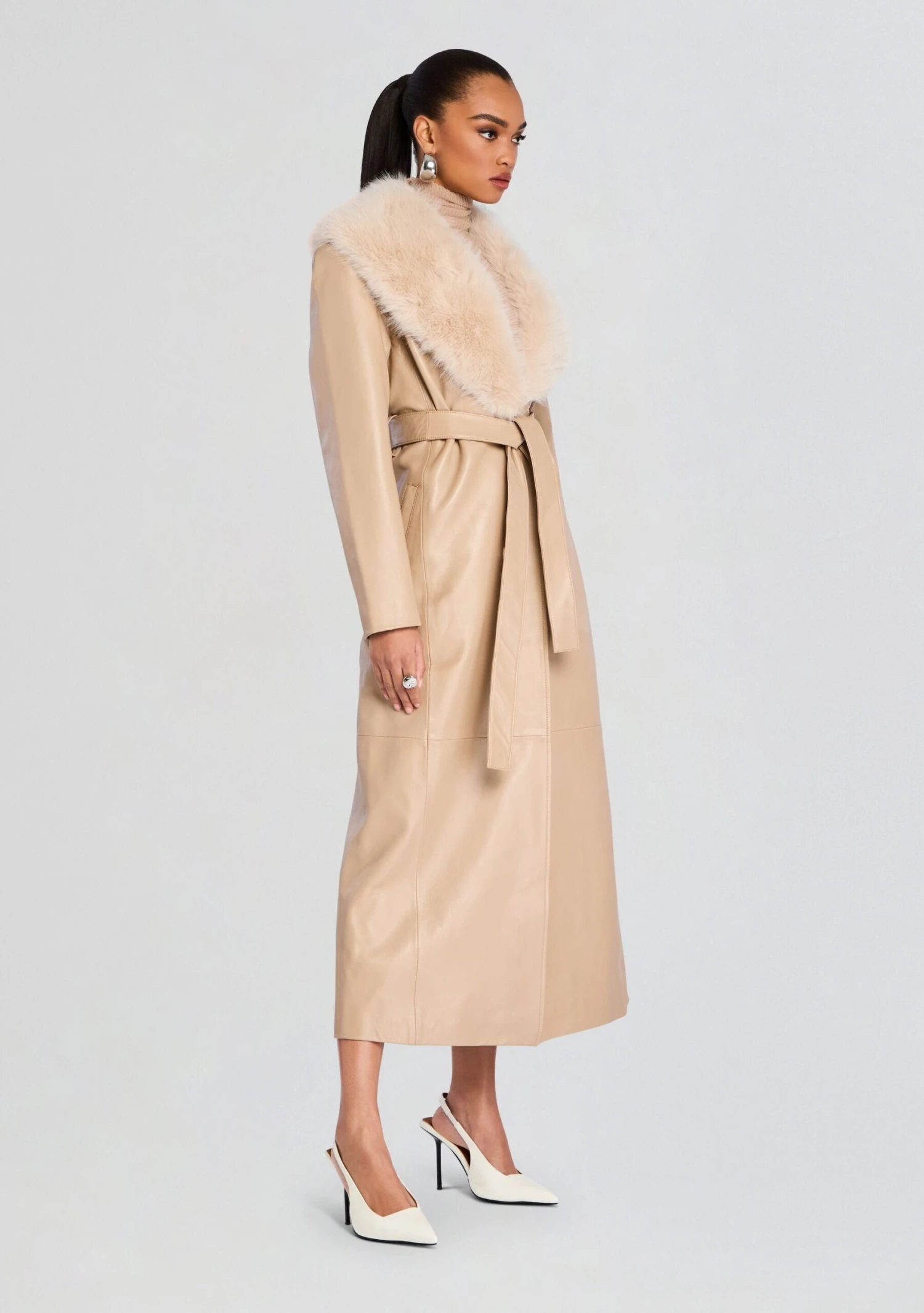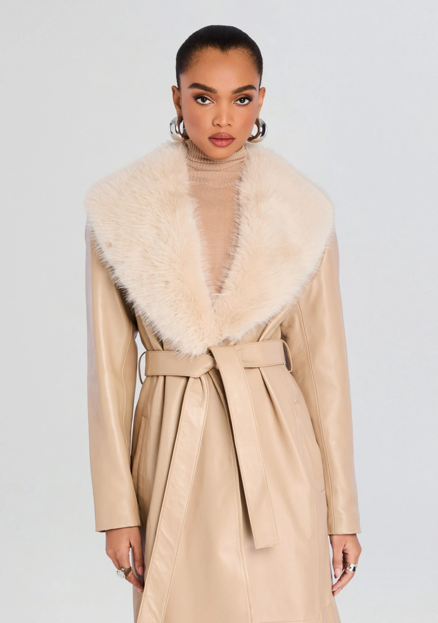 Indulge in the timeless sophistication of our Kieran Trench Coat. Crafted from luxurious lambskin, this coat exudes elegance and refinement. It features a removable faux fur detailing and a belt for a versatile look, perfect for any occasion. Elevate your style with this premium piece.