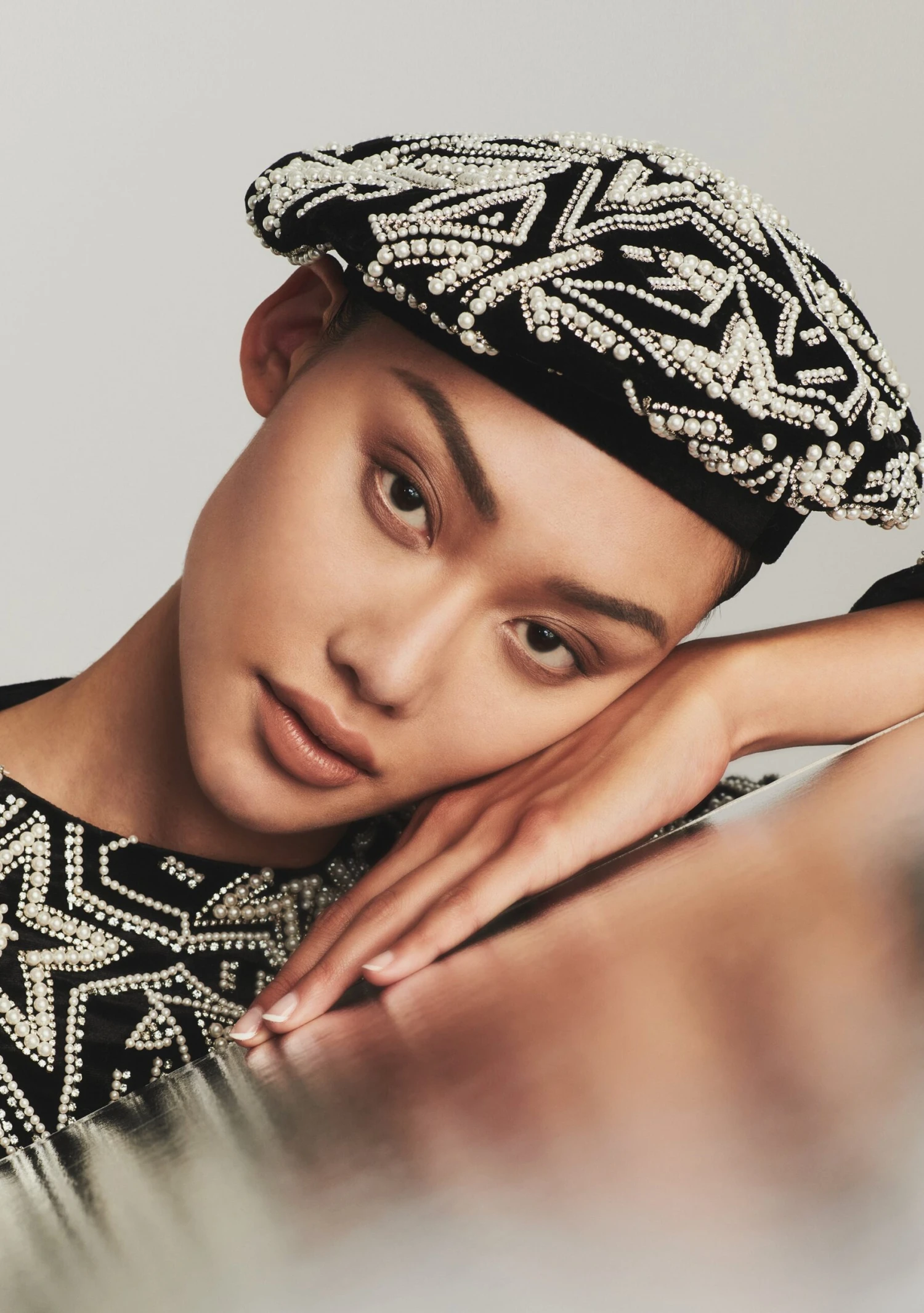 Unleash your inner star in the Leo Beret. This velvet hat shows off intricate pearl and crystal embellishments. Shown here in Pearl Star.