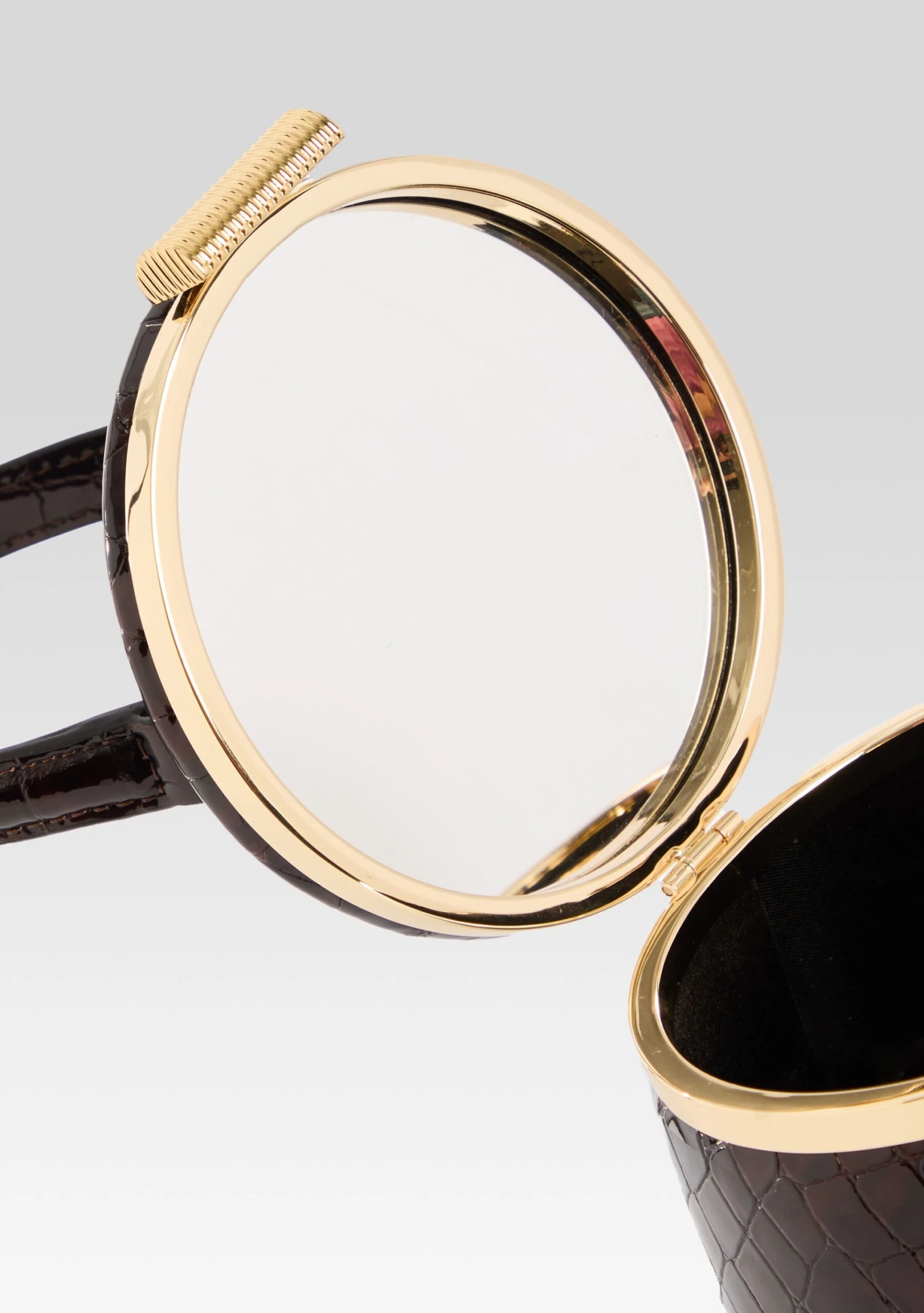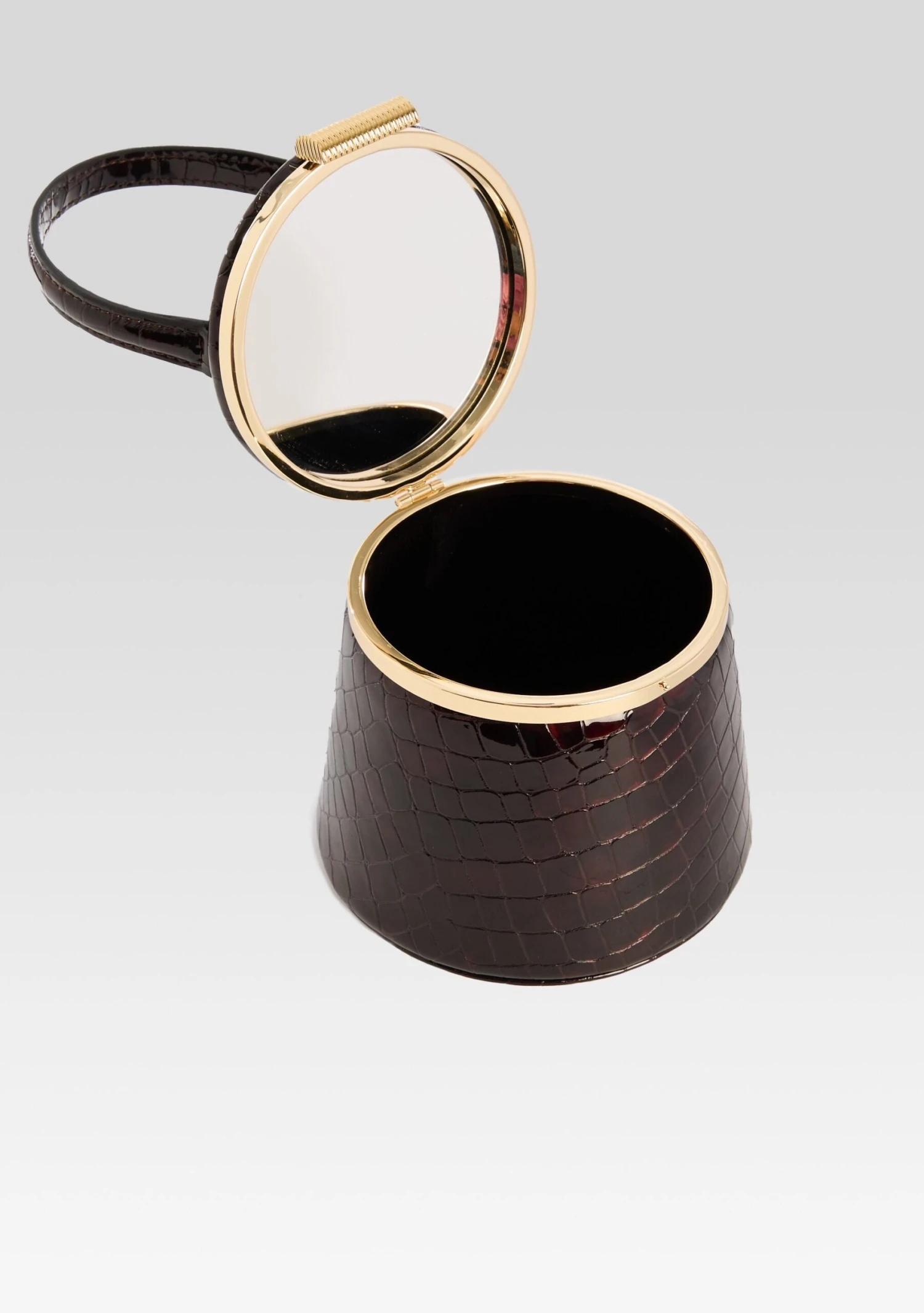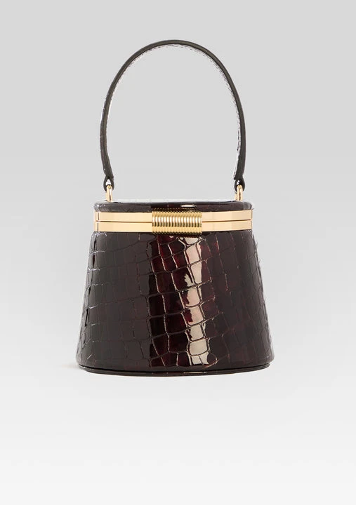 Experience elegance and versatility with the Lesla Case. With its top handle and gold hardware, this small case bag exudes luxury. The inside mirror adds functionality, while the option to wear it as a top handle or crossbody makes it perfect for any occasion. Shown here in Burgundy Croco.