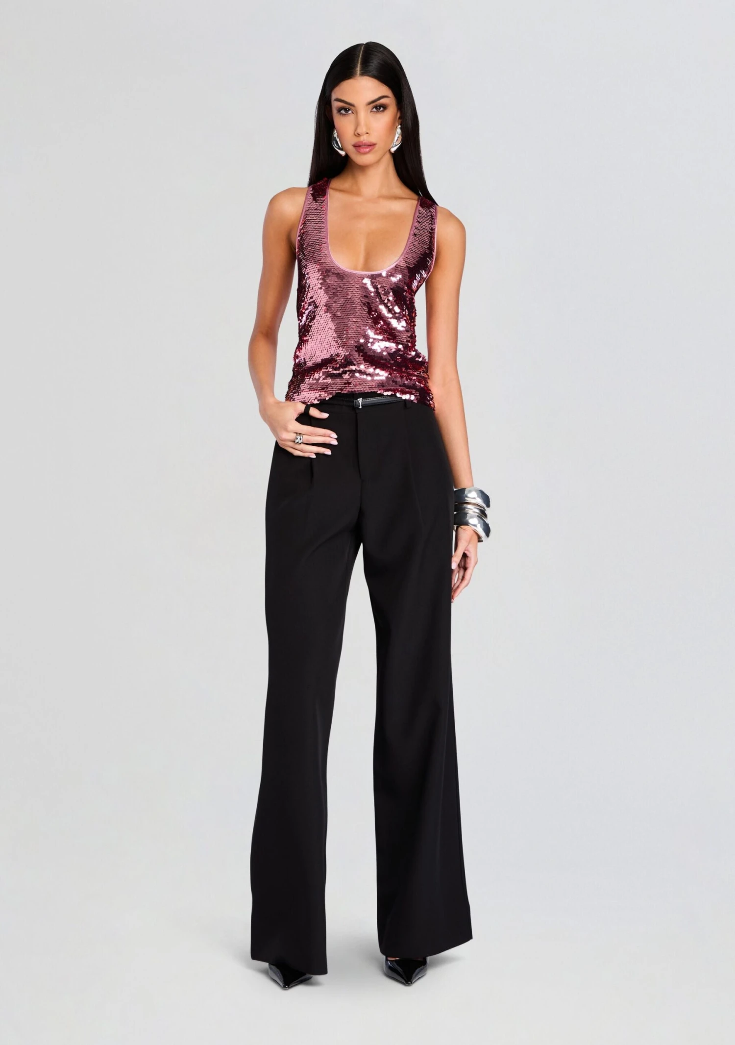 Indulge in luxury with our Mandy Sequin Top. This scoop neck tank top boasts an all over sequin design, perfect for a night out or dinner date. Elevate your look with a touch of sparkle and sophistication.
