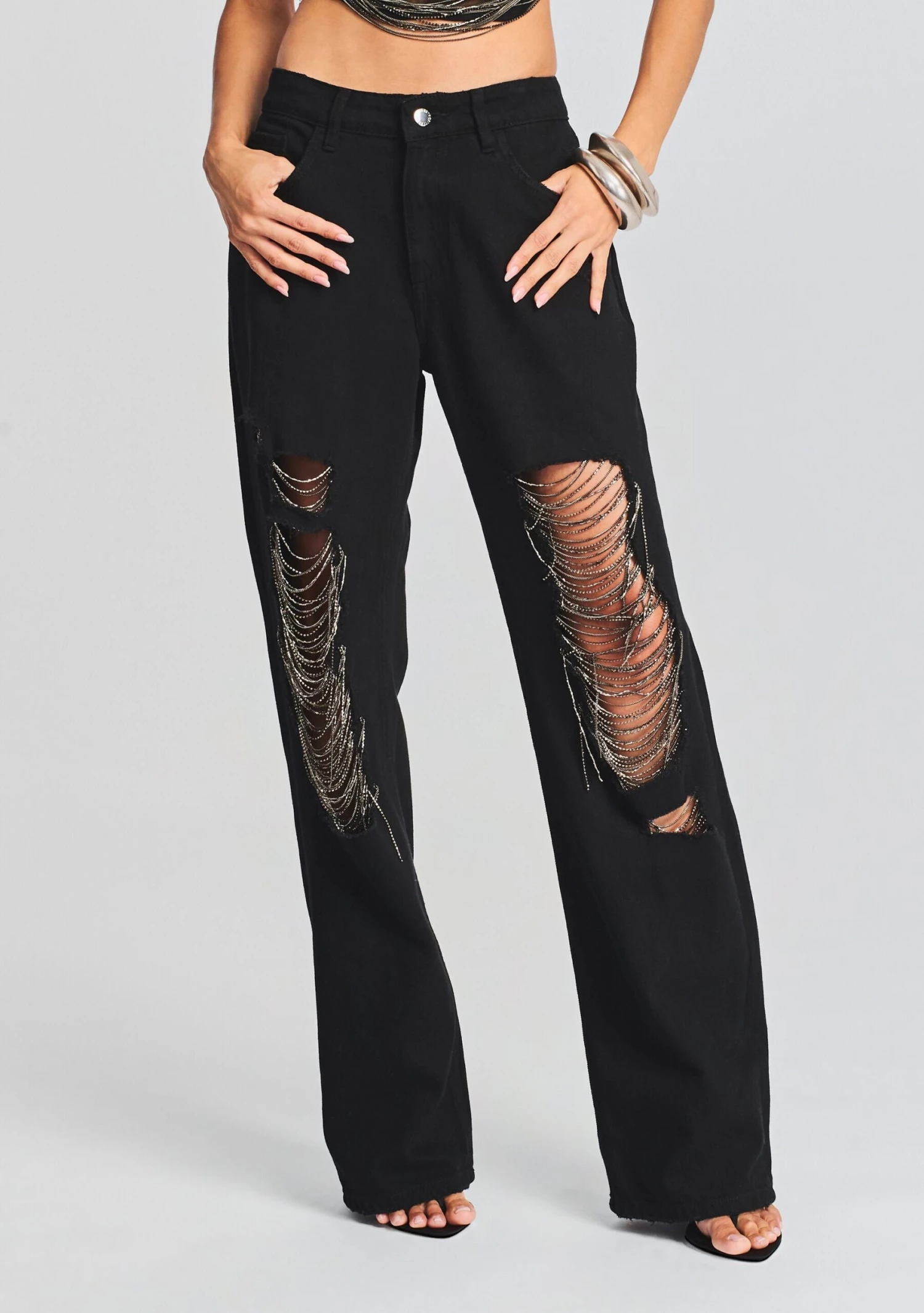 Elevate your fashion game with our Marlowe Jean featuring Embellished Rhinestone Drapes, designed to turn heads and make you the center of attention. Shown here in Raven Black.