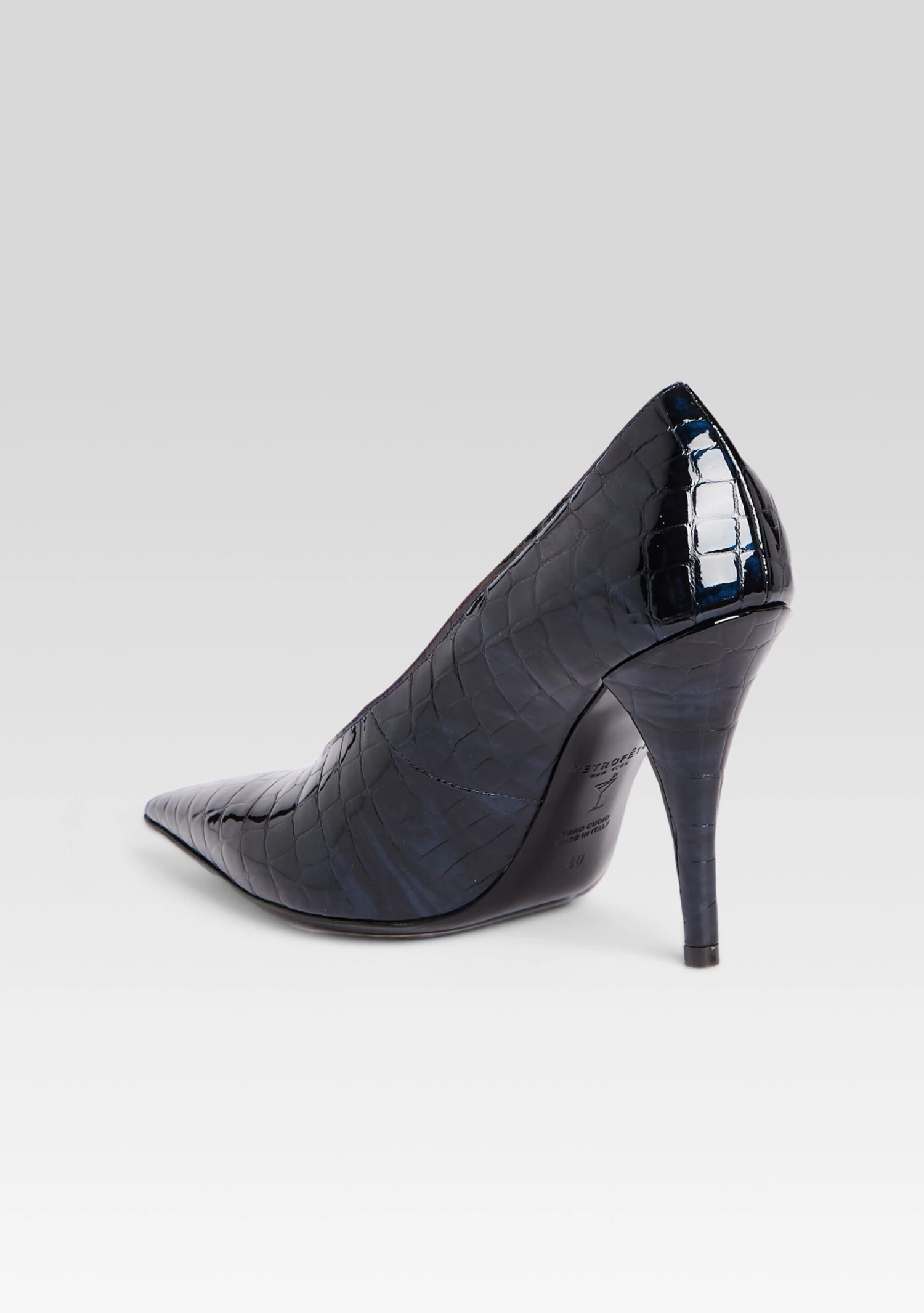 Step into sophistication with the Maureen Leather Pump. Crafted from luxurious croc leather, this pump offers a pointed toe for a sleek, elegant look. Elevate any outfit with the added touch of glamour and class. Shown here in Navy Croco.