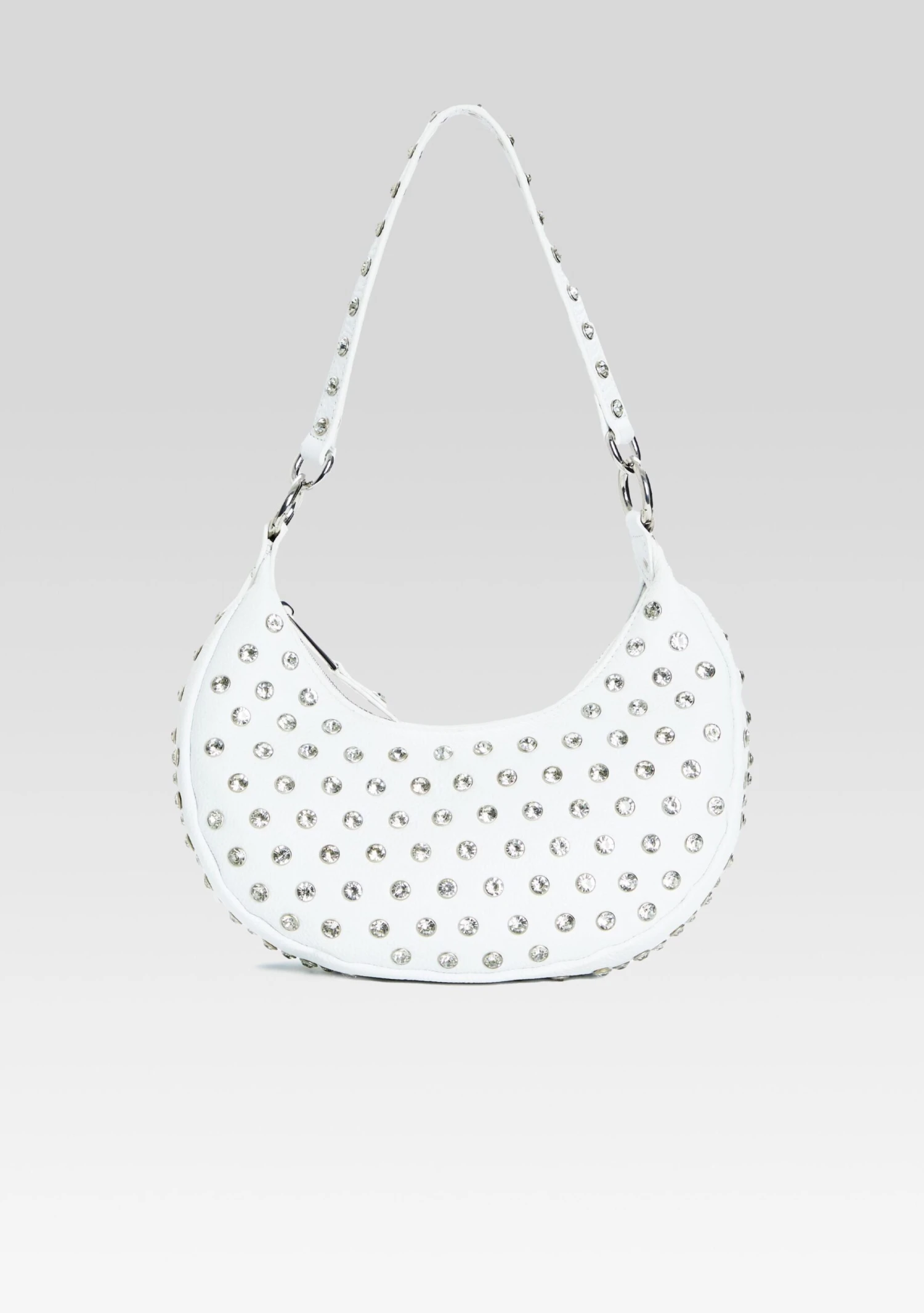 The Maybelle Leather Bag is the epitome of understated luxury. Crafted from supple leather, this hobo bag features dazzling crystal embellishments that catch the light with every move. Spacious and stylish, it’s the perfect companion for both day and night. Shown here in White.