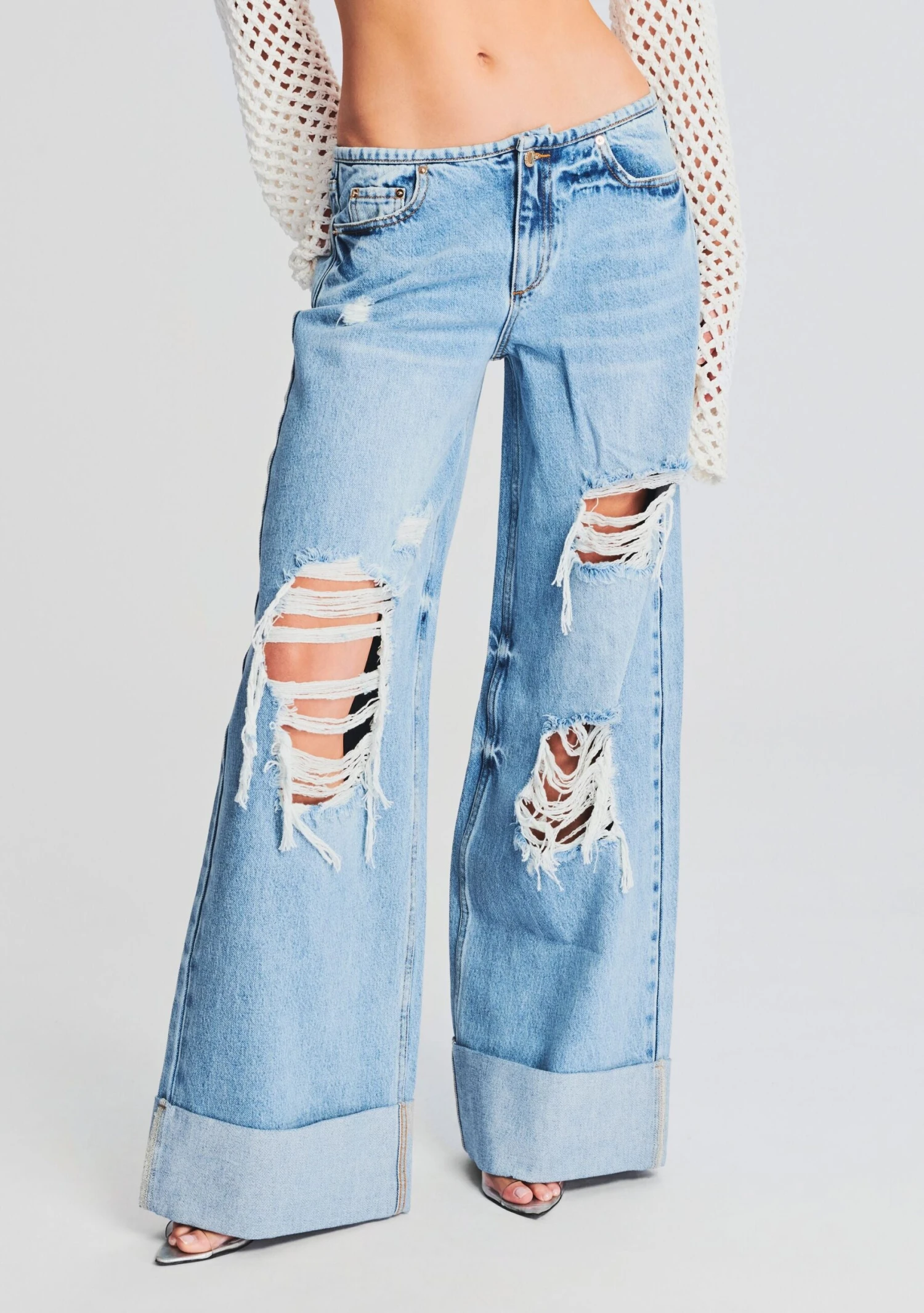 Stay on trend in our Mila Jean. This baggy denim pant features exaggerated front rip cutouts and a rolled up hem for added style. Shown here in Vintage Celeste.