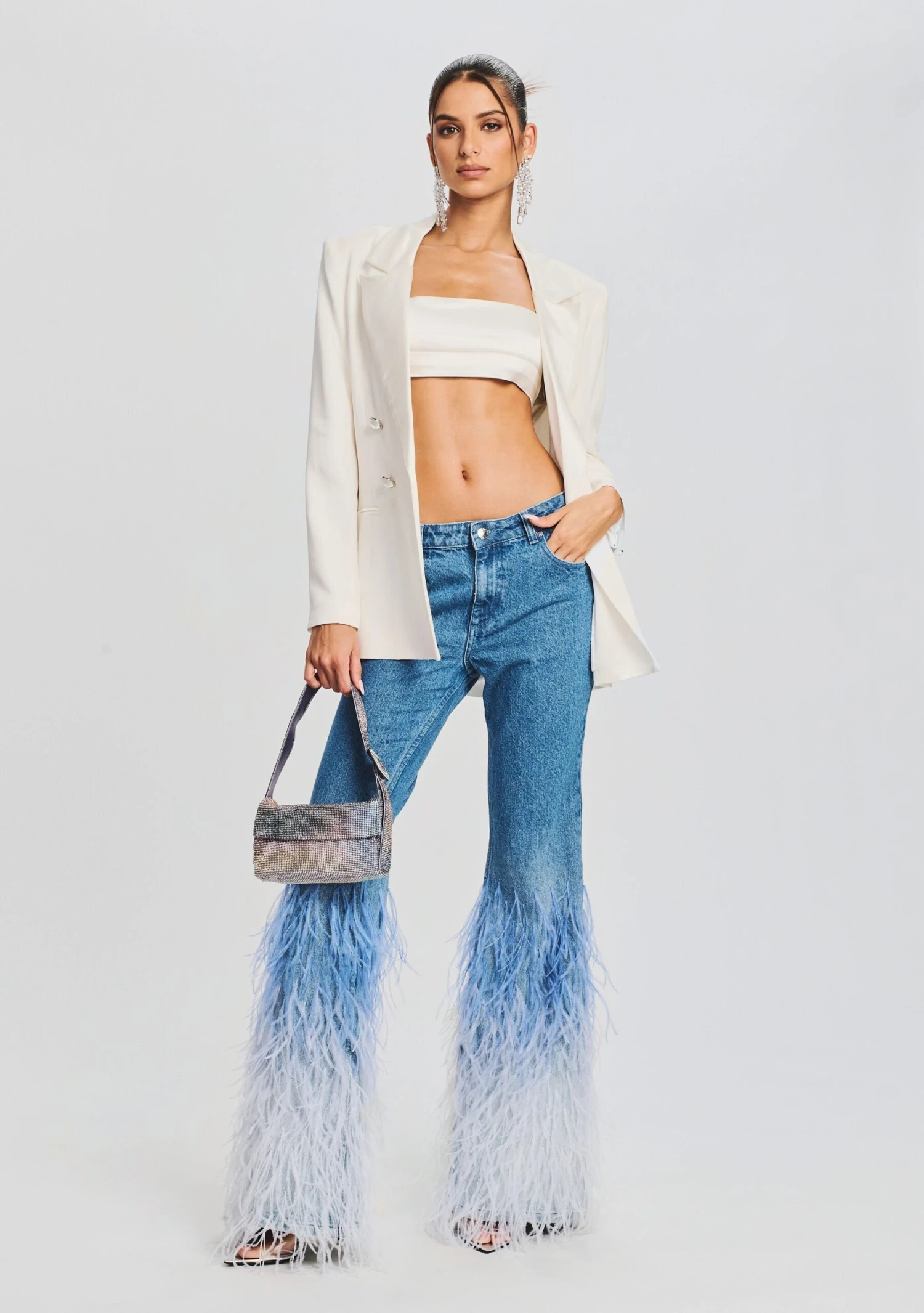 The Moore Feather Jean is a classic five-pocket flare jean with a fantastic feathered twist. Cascading down the leg are artfully layered ombre feathers. Wear them when you want to add a touch of drama to the everyday. Shown here in White/Ombre.