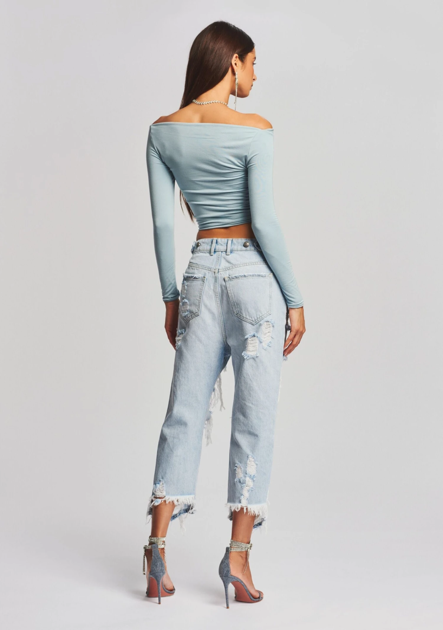 The Omar Drop Boyfriend Jean is a low-rise cropped silhouette with heavy distressing throughout. Featuring a dropped crotch and tapered frayed hems, the denim style is cut for a loose fit throughout the leg and is finished with adjustable tabs at the back waist. Shown here in Light Laguna.
