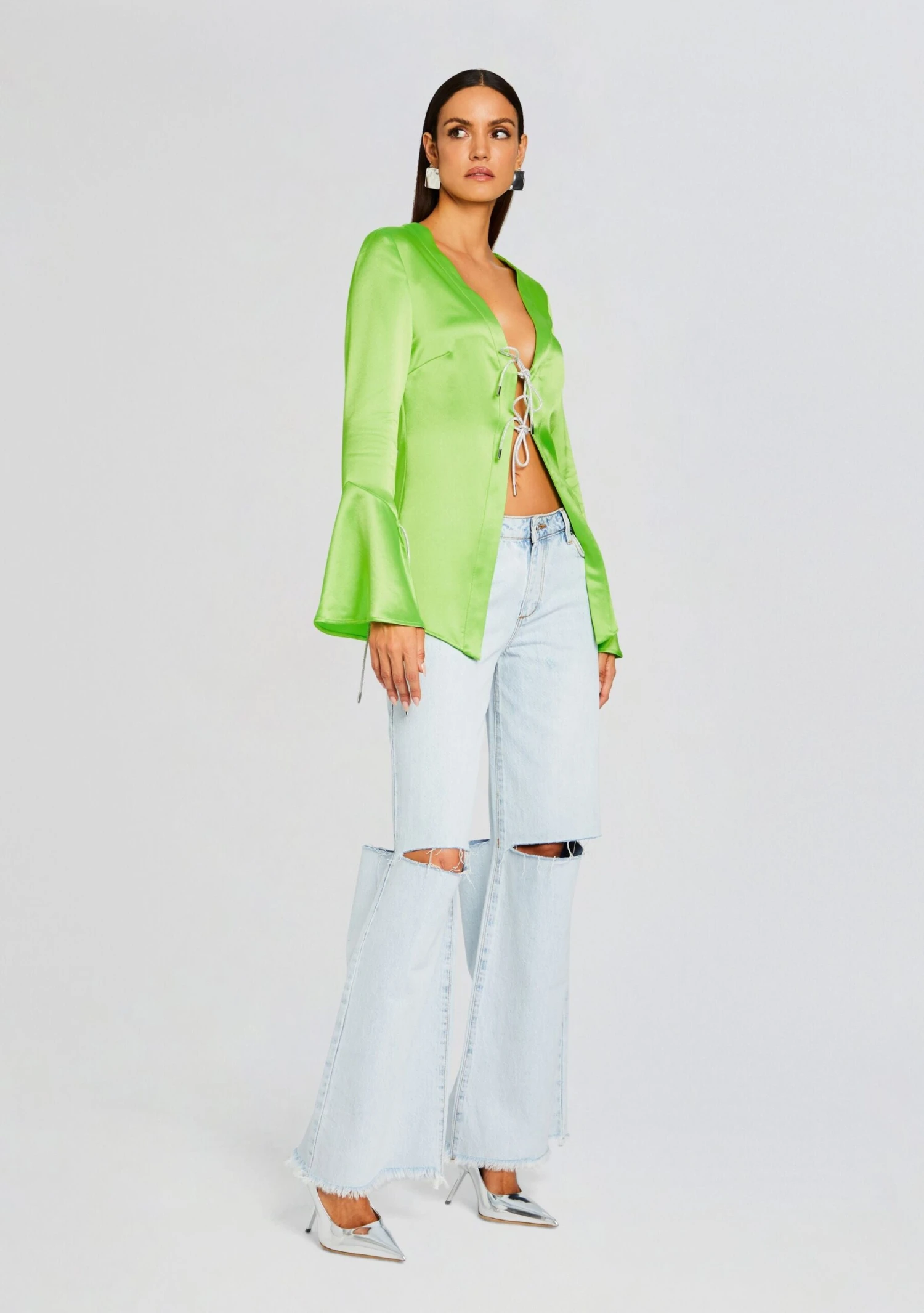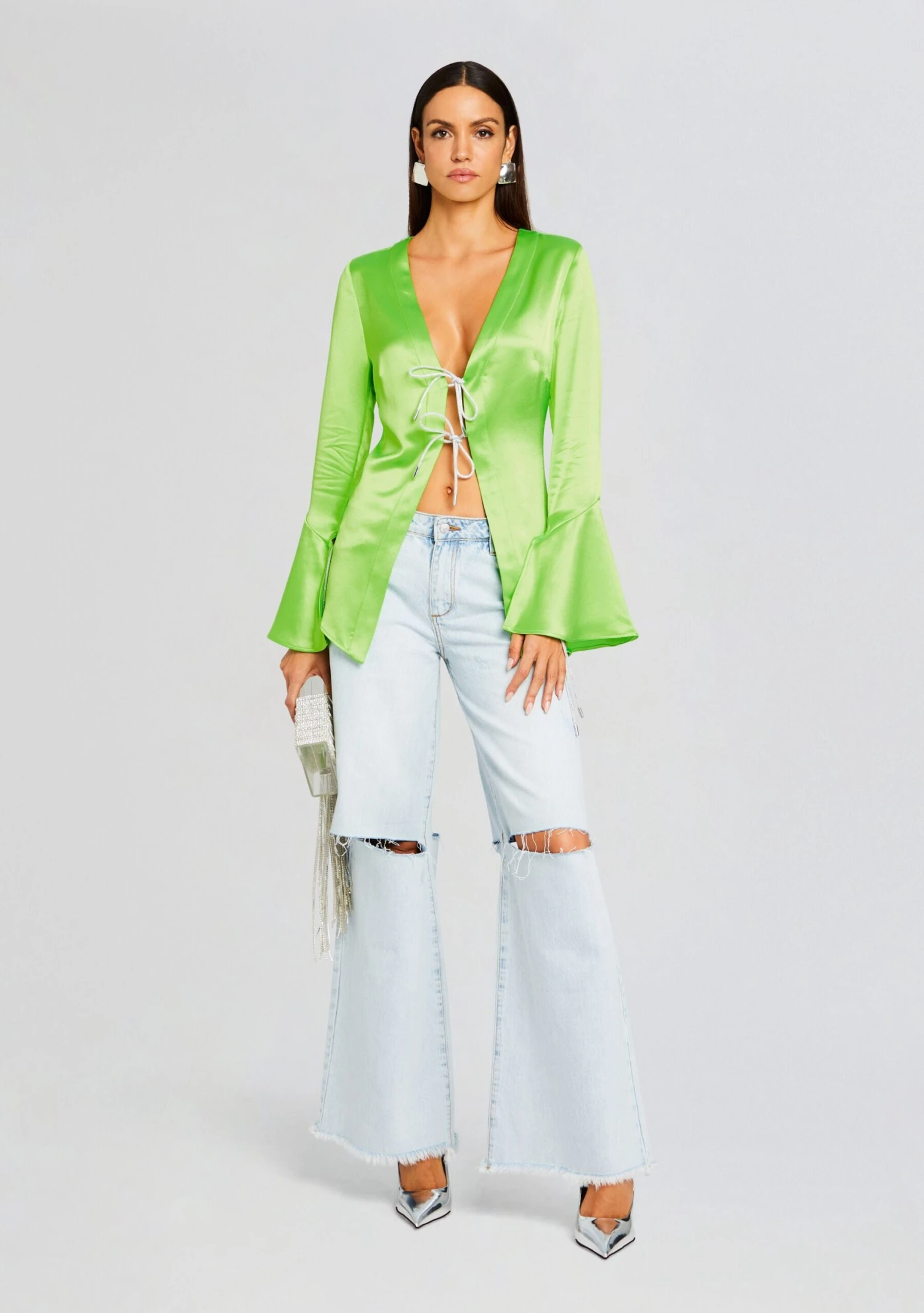 Embrace the fusion of modernity and timeless charm with our Svea Blouse. The front tie closure adds a touch of modern flair, creating a chic and flattering silhouette, while the bell-bottom sleeves exudes a subtle retro charm, infusing your look with a hint of bohemian chic. The versatile design of this blouse makes it perfect for various occasions, whether for a casual day out or a stylish evening affair. Shown here in Fresh Lime.