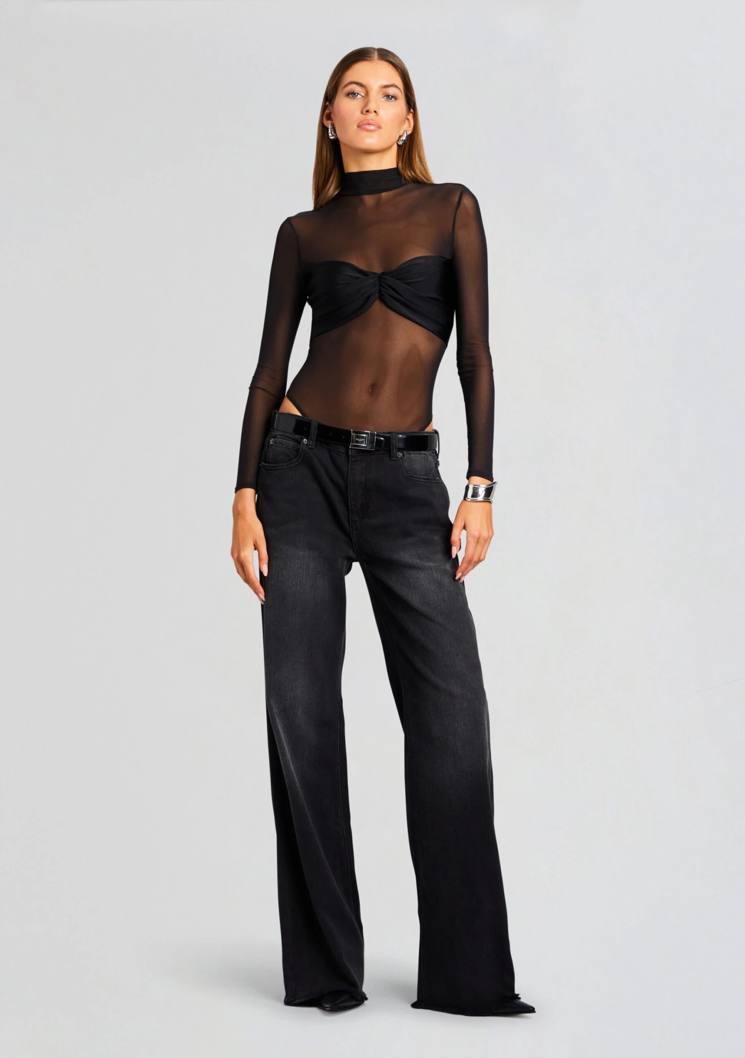 Obsessing over SER.O.YA’s trendy Tonia Bodysuit. This alluring long sleeve sheer bodysuit features a bandeau bodice and sophisticated turtleneck. This bodysuit is the perfect blend of daring and elegance, designed to make a striking fashion statement. Shown here in Black.