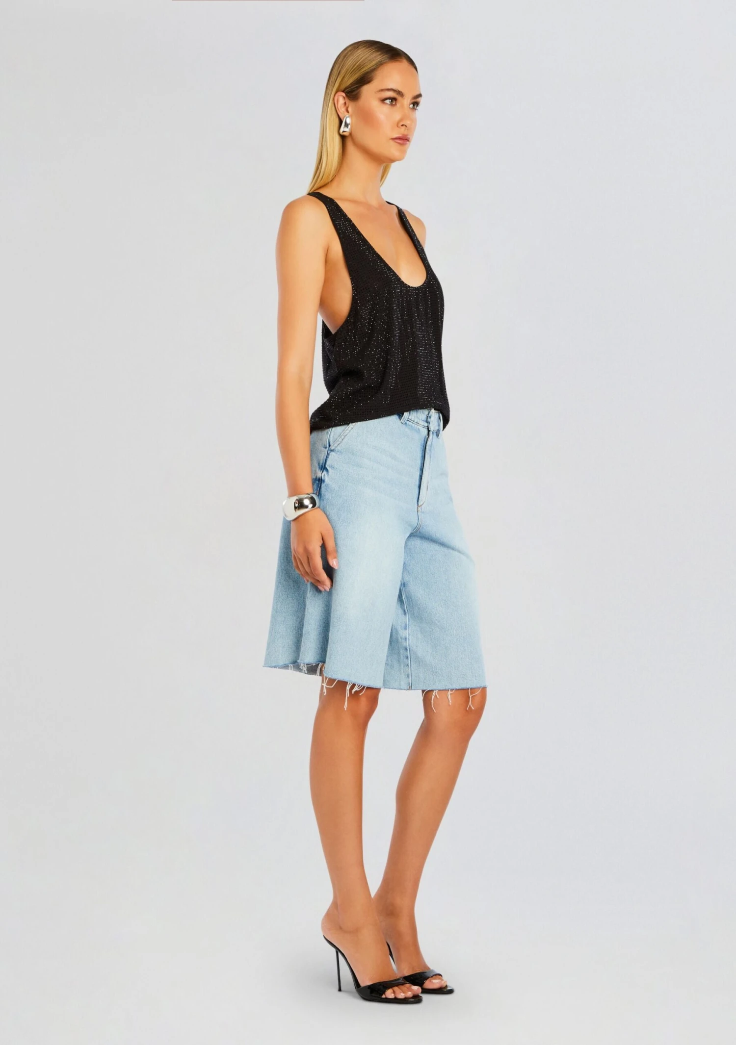 Introducing the Whitney Top – your new go-to for effortless glamour. This stunning white tank top is crafted from a luxuriously soft fabric and features delicate embellishments for a touch of sparkle. Its simple silhouette makes it incredibly versatile, perfect for dressing up or down. Pair it with your favorite denim shorts for a casual daytime look, or elevate it with a sleek skirt and heels for a night out on the town. Shown here in Black.