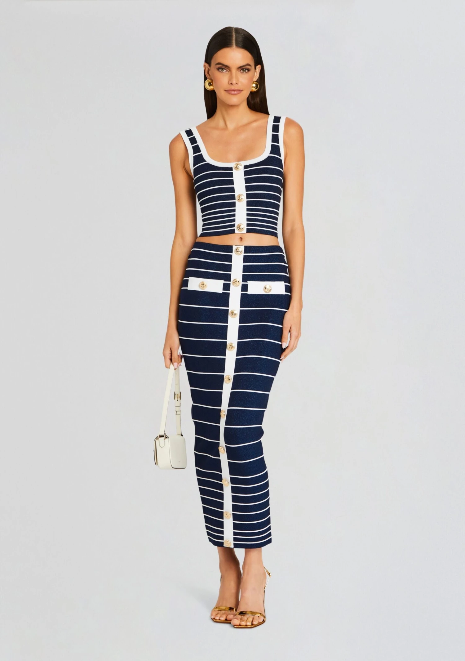 Make a statement in our effortlessly chic Zadie Top. Featuring a flattering square neckline, gold button accents, and a comfortable ribbed knit fabric, this top is perfect for both casual outings and dressier occasions. Pair it with the our Clarissa skirt for a complete look or dress it down with your favorite denim. Shown here in Metallic Navy/White.